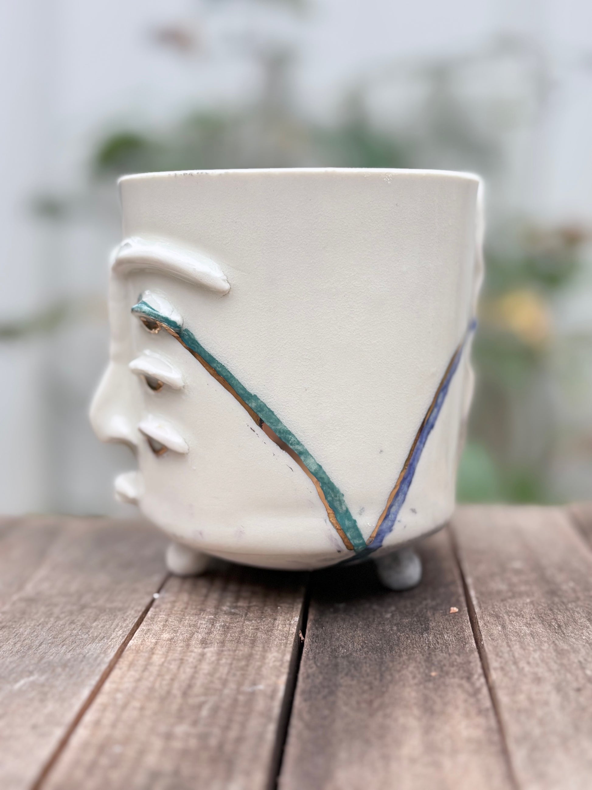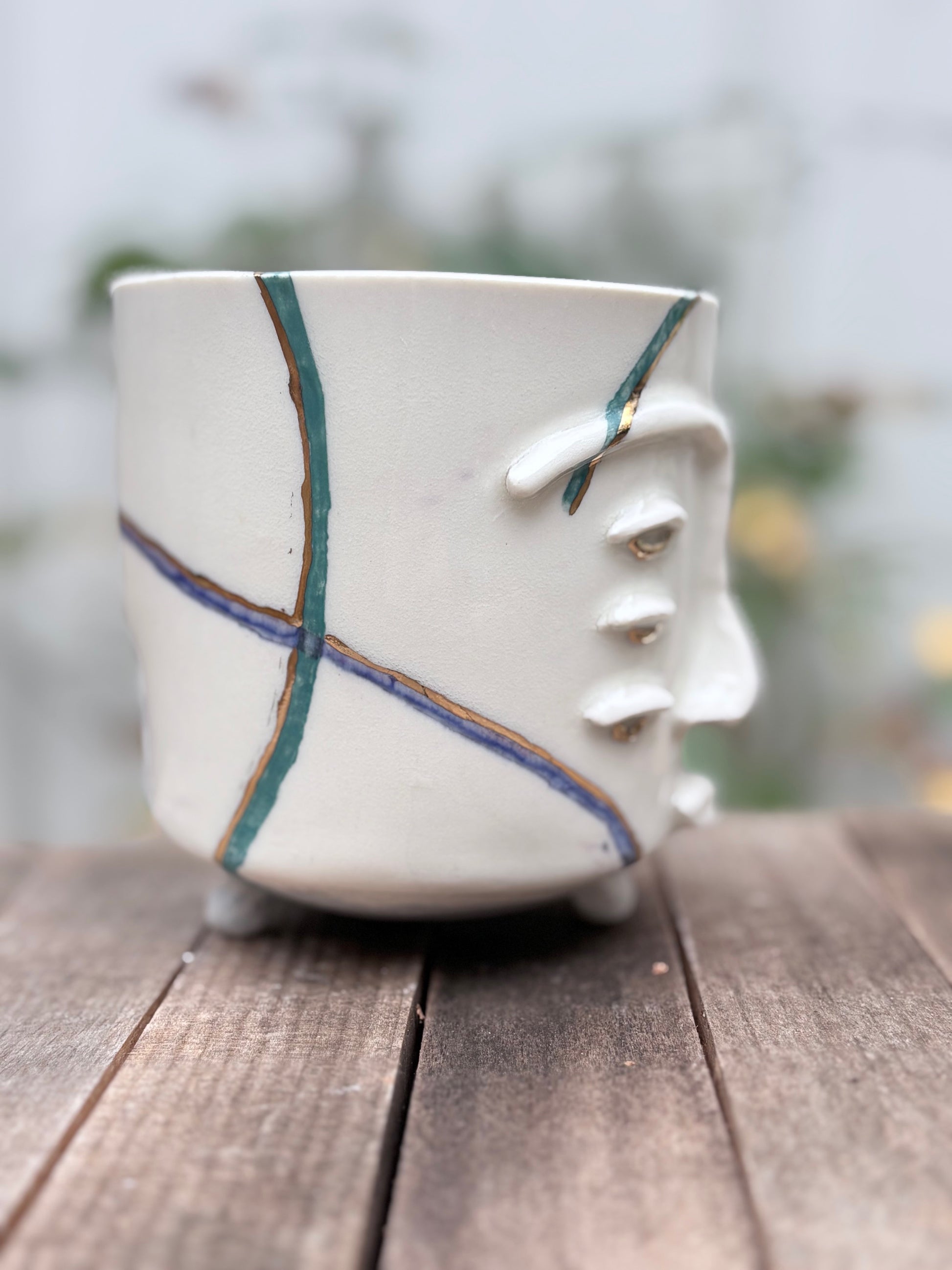 This one of a kind cup explores the ceramic tradition of the face jug with a modern take.It has been hand-sculpted from porcelain, coated in a clear, glossy glaze, and embellished with underglazes and 22k gold luster.