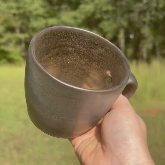 This porcelain mug has been made by hand and glazed in a magical glaze that is a slightly metallic black on the exterior, but shimmer gold on the interior, especially in the sunlight.