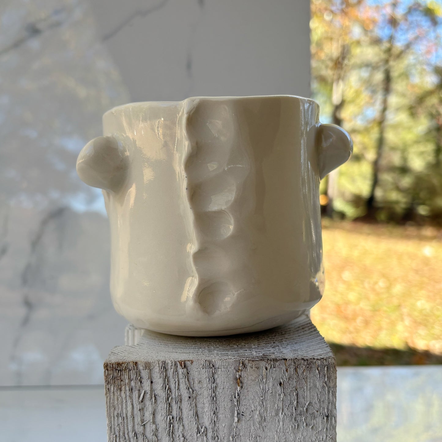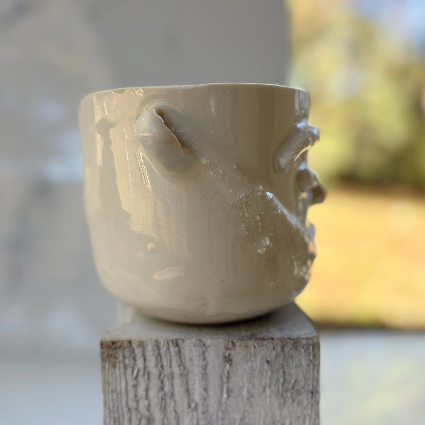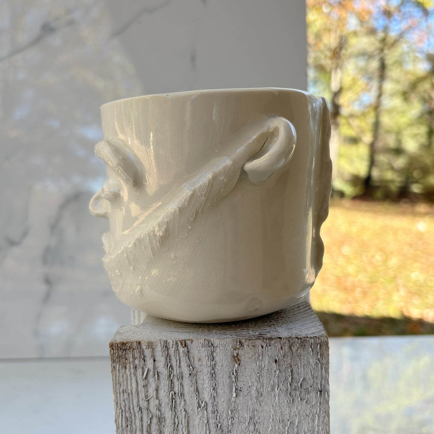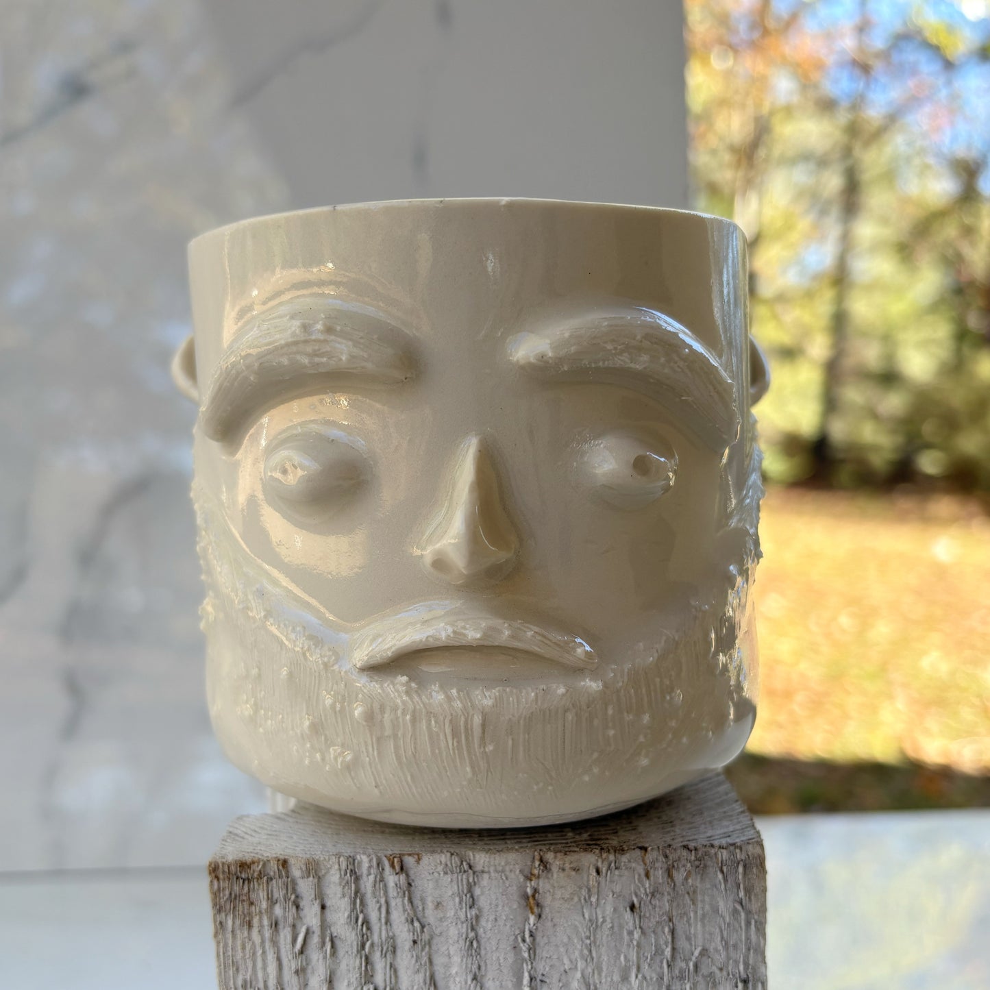 This one of a kind cup explores the ceramic tradition of the face jug with a modern take: the face of a bearded fisherman. It has been hand-sculpted from porcelain and coated in a clear, glossy glaze.